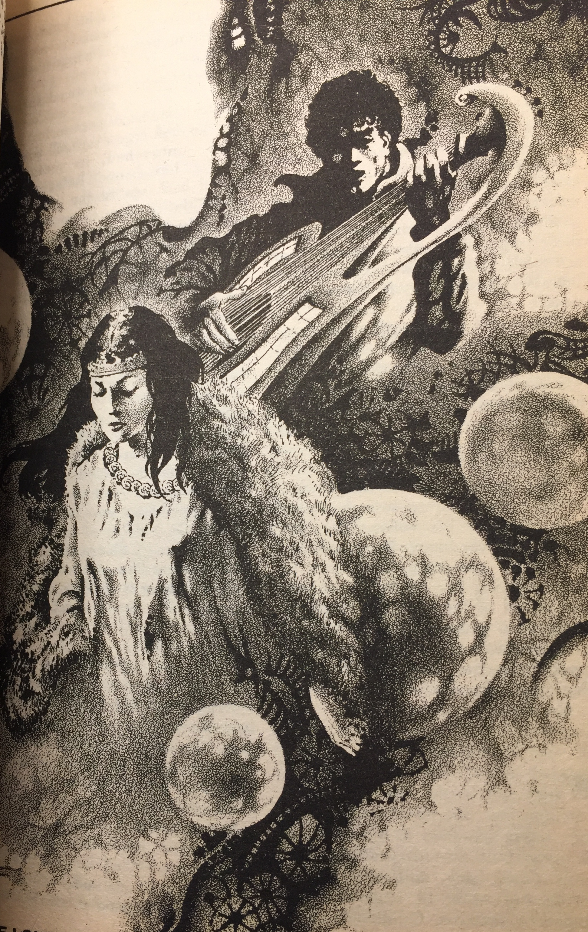 Hardly had the last notes fallen from the air and the final shimmers died than Laren started once again. A new song this time, and one he did not know so well. His fingers, slim and graceful, hesitated and retraced themselves more than once, and his voice was shaky, too, for he was making up some of the words as he went along. Sharra knew why. For this time he sang of her, a ballad of her quest. Of burning love and endless searching, of worlds beyond worlds, of dark crowns and waiting guardians that fought with claws and tricks and lies. He took every word that she had spoken, and used each, and transformed each. In the bedroom, glittering panoramas formed where hot white suns burned beneath eternal oceans and hissed in clouds of steam, and men ancient beyond time lit rainbows to keep away the dark. And he sang Kaydar, and he sang him true somehow, he caught and drew the fire that had been Sharra’s love and made her believe anew.