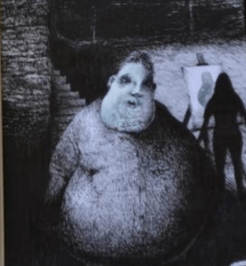 - The Pear-Shaped Man– The pear-shaped Man lives beneath the stairs. His shoulders are narrow and stooped, but his buttocks are impressively large. Or perhaps it is only the clothing he wears; no one has ever admitted to seeing him nude, and no one has ever admitted to wanting to. His trousers are brown polyester double knits, with wide cuffs and a shiny seat; they are always baggy, and they have big, deep, droopy pockets so stuffed with oddments and bric-a-brac that they bulge against his sides. He wears his pants very high, hiked up above the swell of his stomach, and cinches them in place around his chest with a narrow brown leather belt. He wears them so high that his drooping socks show clearly, and often an inch or two of pasty white skin as well. His shirts are always short-sleeved, most often white or pale blue, and his breast pocket is always full of Bic pens, the cheap throwaway kind that write with blue ink. He has lost the caps or tossed them out, because his shirts are all stained and splotched around the breast pockets. His head is a second pear set atop the first; he has a double chin and wide, full, fleshy cheeks, and the top of his head seems to come almost to a point. His nose is broad and flat, with large, greasy pores; his eyes are small and pale, set close together. His hair is thin, dark, limp, flaky with dandruff; it never looks washed, and there are those who say that he cuts it himself with a bowl and a dull knife. He has a smell, too, the Pear-shaped Man; it is a sweet smell, a sour smell, a rich smell, compounded of old butter and rancid meat and vegetables rotting in the garbage bin.